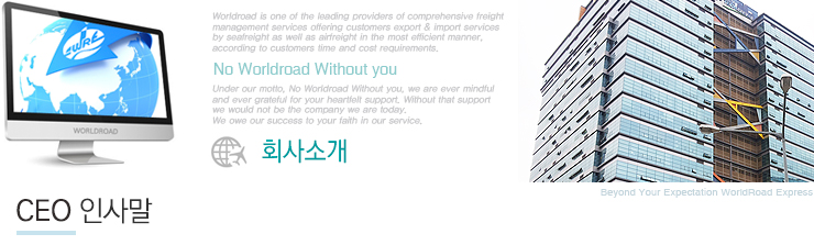 매년 강소기업으로 거듭나기 위해 "No WorldRoad Without You!"를 회사의 모토로 삼아 당사의 마스코트인 개미처럼 고객님의 소중한 화물을 세계 어느 곳이나 바다와 하늘을 이용하여 운송하도록 하겠습니다. 전세계에 네트워크를 구축하여 원활한 물류서비스, 차별화한 서비스, 고객이 만족하는 서비스, 고객이 다시 찾아오고 싶은 포워더로 거듭나도록 하겠습니다. 고객님을 향한 특화된 물류서비스에 원하신다면 월드로드항공해운(주)를 찾아 주십시요.